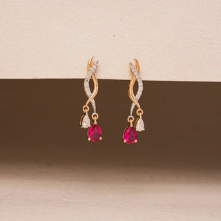 The image showcases a side close-up view of a pair of female Earrings of 14 KT secured with a bombay screw weighing a total of 1.22 grams . The earrings are crafted in 14 KT rose gold and feature a unique raindrop-inspired design. Each earring consists of a small, round diamond-encrusted sphere suspended from a delicate rose gold loop adorned with smaller lab grown diamonds of  0.28 carat