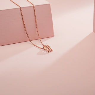 The front view is of the model's neck with a size of 17.5 inches, a female pendant necklace crafted with 0.30 carats in 14 KT rose gold weighing 3.92 grams secured through a spring lock. The pendant features a unique bow design with an asymmetrical twist, highlighting a central diamond. The background enhances the piece's elegance and the lab-grown diamonds sparkle.