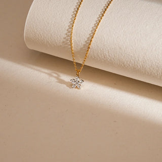 Side view of a beautiful female Diamond Pendant is crafted in 14 KT rose gold and features 0.61 carats of lab-grown diamonds with a total product weight of 1.44 grams. Displayed on a model's neck, the delicate clover design adds a touch of luck and elegance to any ensemble.