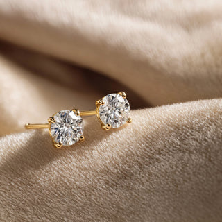 Front view of Cupid’s Love Diamond Stud Earrings on neutral beige background. Elegant white gold 18KT studs with EF colour, VVS clarity lab grown diamonds weighing 2.05 carats in total, featuring solitaires of 1.03 carats each.