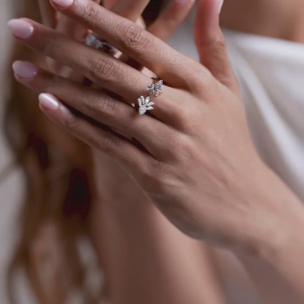With the Whispering Leaves Eternal Diamond Ring, nature's poetry comes to life through fine jewellery, capturing tranquillity and grace in every detail. The delicate open design has delicate leaf shapes at each end, and EF-colour, VVS-clarity lab-grown diamonds that shimmer and dance as delicately as the breeze with every movement. The whimsical use and light-as-air silhouette suggest new beginnings and make this ring ideal for day-to-day wear or as a well-meant gift, suggesting ever after.