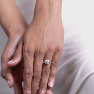 The regal halo design features EF color and VVS clarity diamonds including a solitaire of 0.49 carats. Royal crown for the center stone.