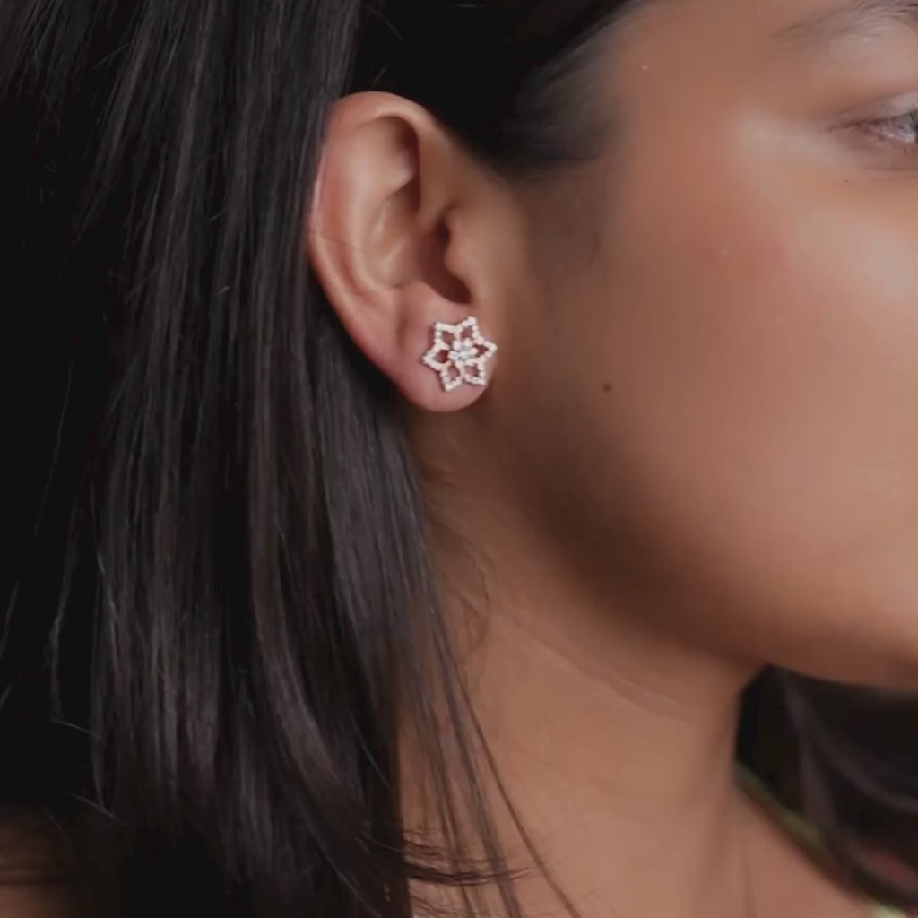 Nature's radiance captured in jewelry, these earrings feature a cluster of diamonds arranged in a sunburst pattern, evoking the shape of a blooming flower. The diamonds radiate outward, creating a dynamic, warm effect that celebrates natural beauty and growth.