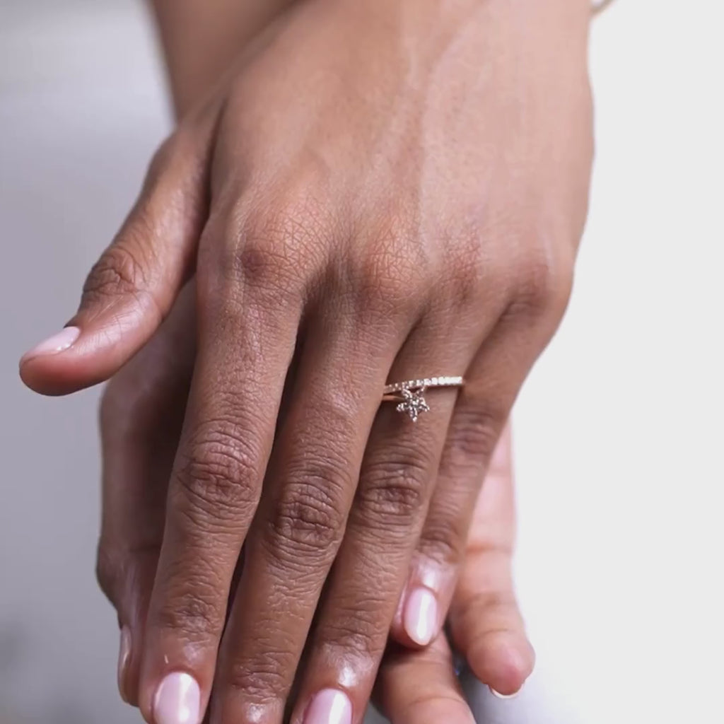 Style: Delicately balanced between nature's inspiration and modern craftsmanship, poetic expression of renewal. Charming five-petal floral motif brought to life with sparkling round diamonds, sleek open band wrapping gently around finger. Pavé diamond band gracefully intersects creating unique two-in-one layered silhouette enchanting as spring bloom.