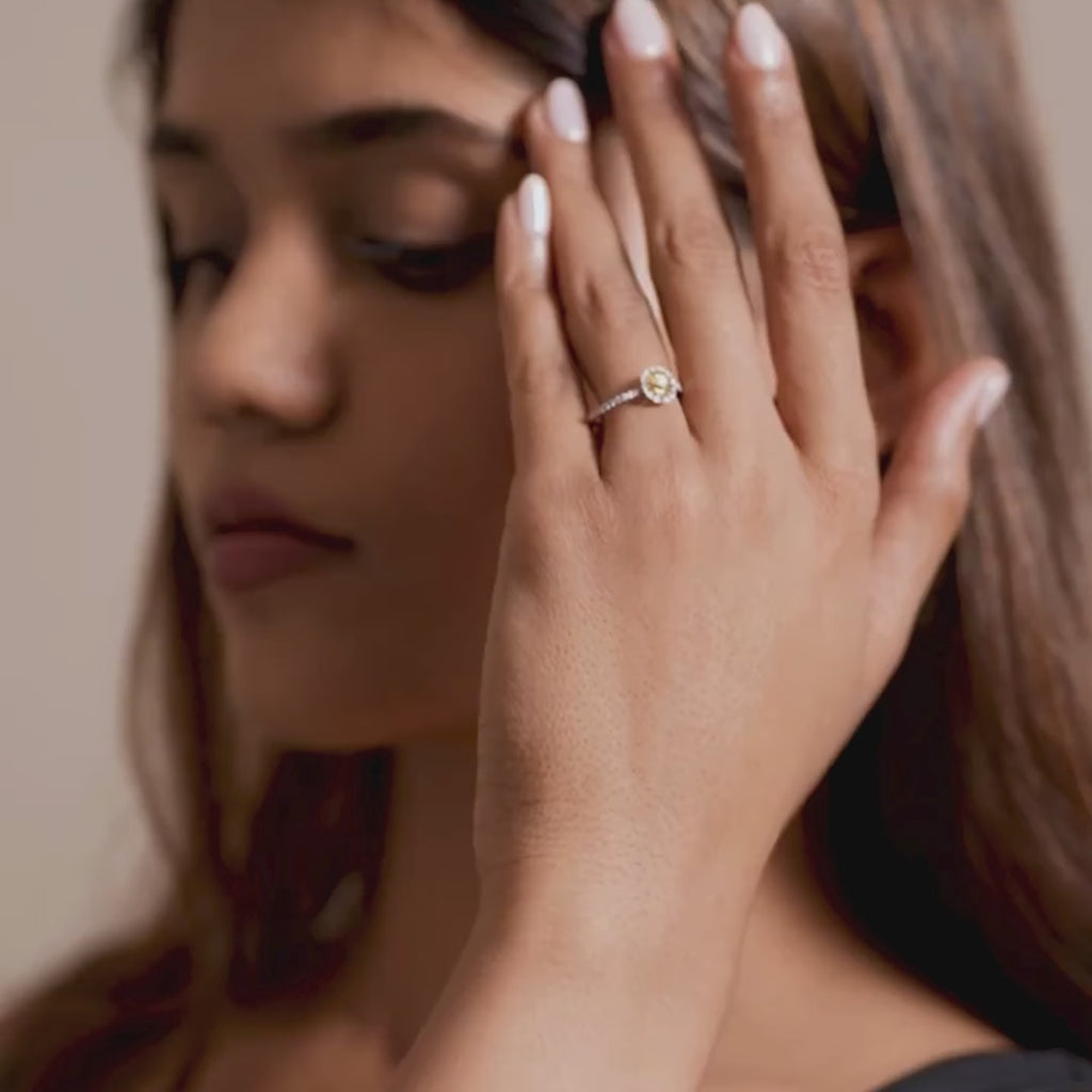Style of Diamond of the Ring: At heart of this beautiful piece is sparkly EF-colour, VVS-clarity lab-created diamond floral cluster glistening like morning sun before slowly draining into delicate petals at every glimmer. Gentle contour work alongside 14 KT Yellow Gold band echoes futility of nature.