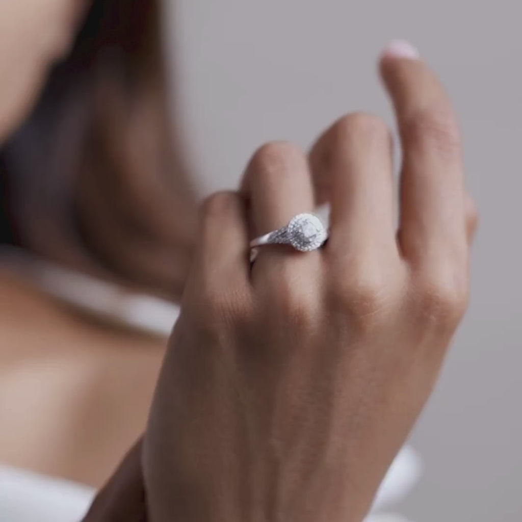 Style of Diamond of the Ring: Features a sparkling round diamond at the center surrounded by double halos with pavé set stones that enhance its fire and sparkle. The split shank adds detail and elegance, making it a timeless symbol of sophistication.